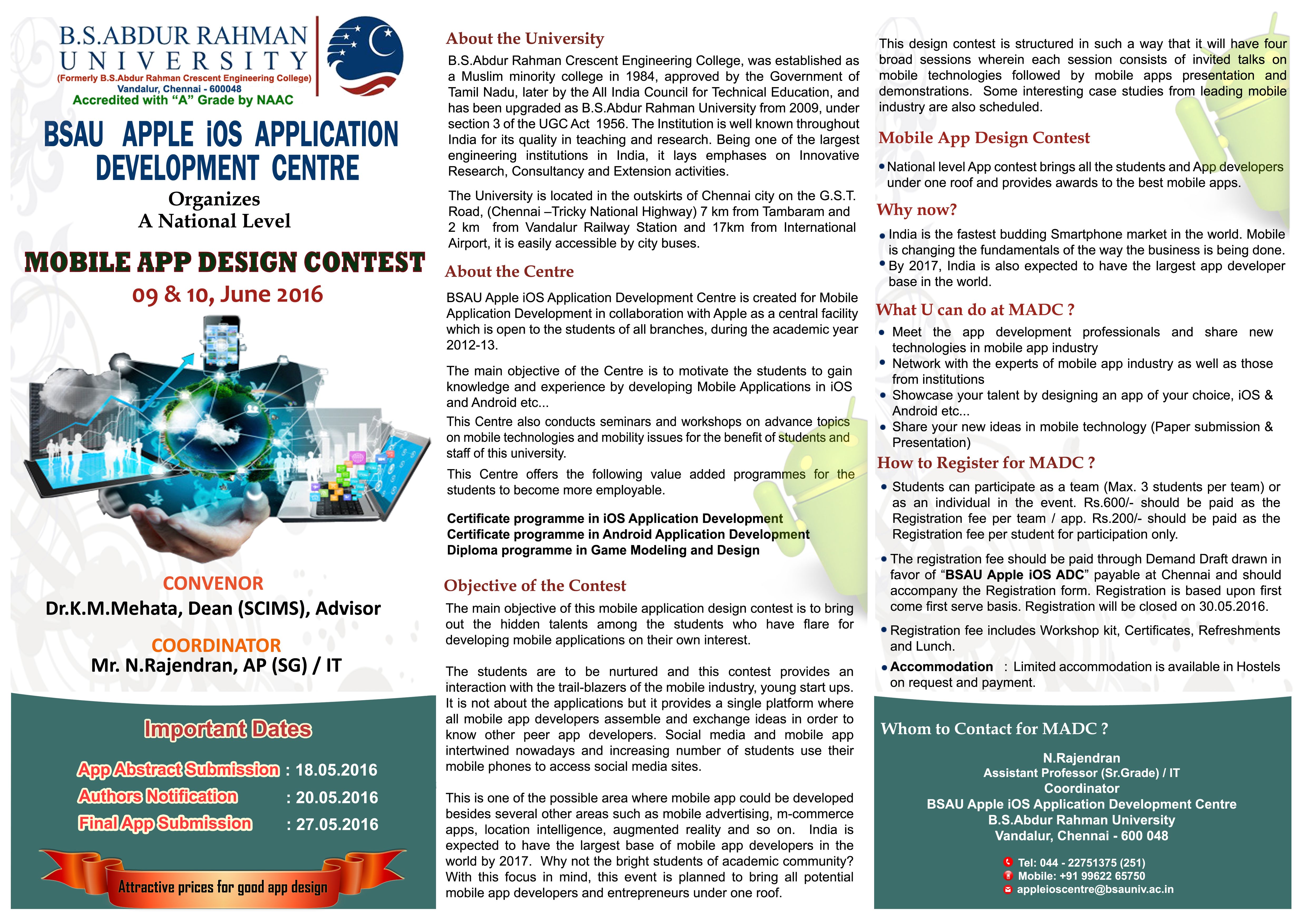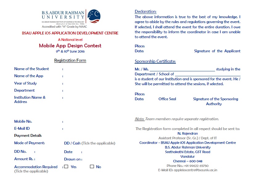 ** The registration fee should be paid through Demand Draft drawn in favor of “BSAU Apple iOS ADC” payable at Chennai and should accompany the Registration form. Registration is based upon first come first serve basis. Registration will be closed on 30.05.2016.