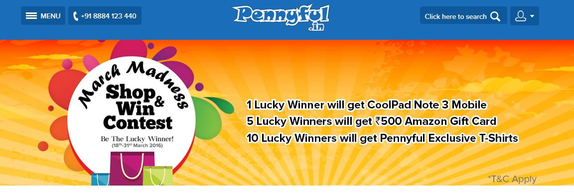 ** To enter the ”March Madness: Shop & Win” Contest, you must be a legal resident of India. Pennyful.in employees, their immediate family members (spouses, partners, parents, grandparents, siblings, children and grandchildren), and our affiliates, advisors or advertising/promotion agencies (and their immediate family members) are not eligible to enter the ”March Madness: Shop & Win” contest.
