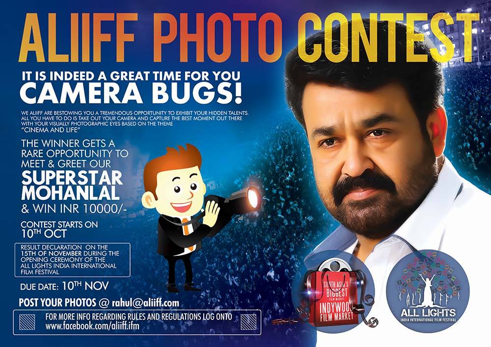 Exciting news for all you shutterbugs! All Lights India International Film Festival, is giving you a once in a lifetime oppurtunity. Ready to get enchanted! It is time to activate your photographic eyes. There is no way you can miss this golden chance. Wait till you hear the prize! You get to meet and greet the Superstar Mohanlal! How could this be any better? Well along with that oppurtunity, you get a cash prize of Rs.10000! What are you waiting for?! Get your cameras and start clicking!