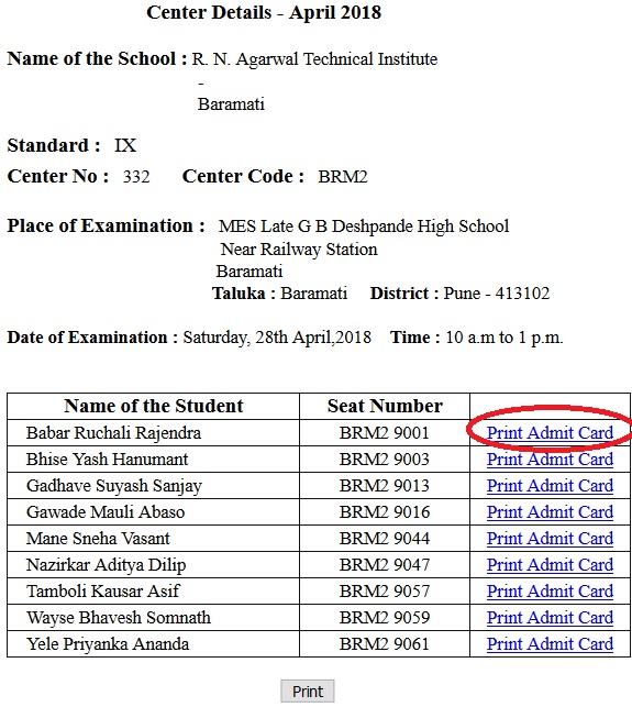 Step 5 : It will provide the Center details as shown below. You can also Print your Admit Card by clicking Print button.