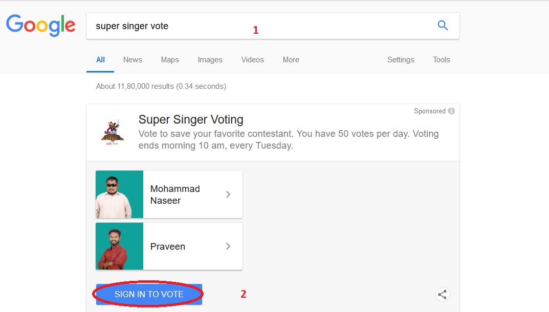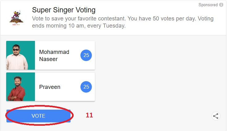 Step 1 : Visit Google site (google.co.in) and Type “Super Singer Vote”