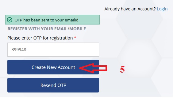 Step-5 : OTP (One Time Password) has been sent on your Registered Email ID and Mobile Number. Enter the OTP and Click on the ‘Create New Account’ button.