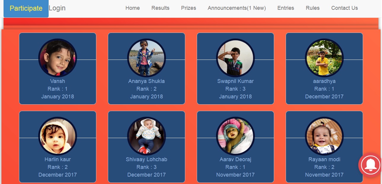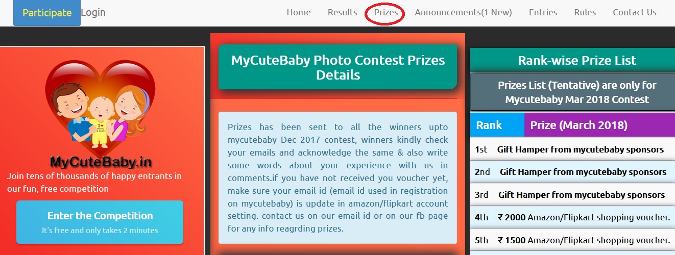 Go to the ‘Prizes’ link available at the top of the Home page of mycutebaby.in to view the Rank-wise Prize List .