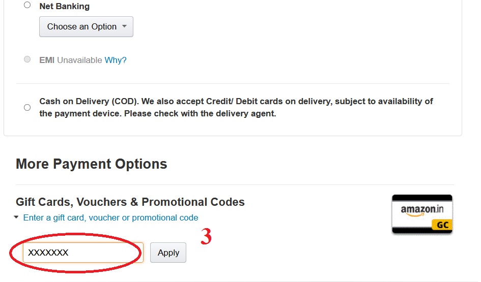 Step-3 : Enter the code of the gift card directly on the payments page while checking out an item. This will automatically add the Amazon Pay Balance to your account and will be applied to your purchase.