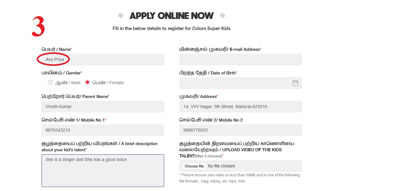 Participant’s parents/legal guardian shall make a video of his/her child (not more than 3 minute and in mpg, mpeg, avi, mp4,mov formats) performing/showcasing her/her talent and upload the same on the online registration form.