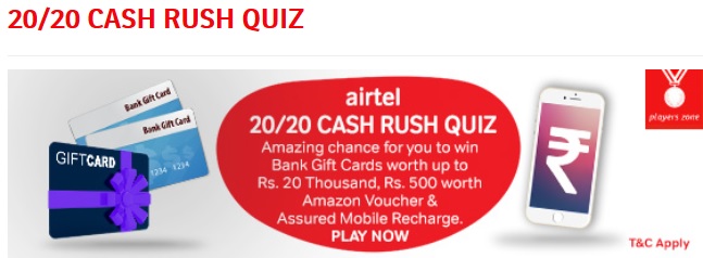 Airtel 20/20 Cash Rush Quiz Contest 2018 : airtel.contestzone.in