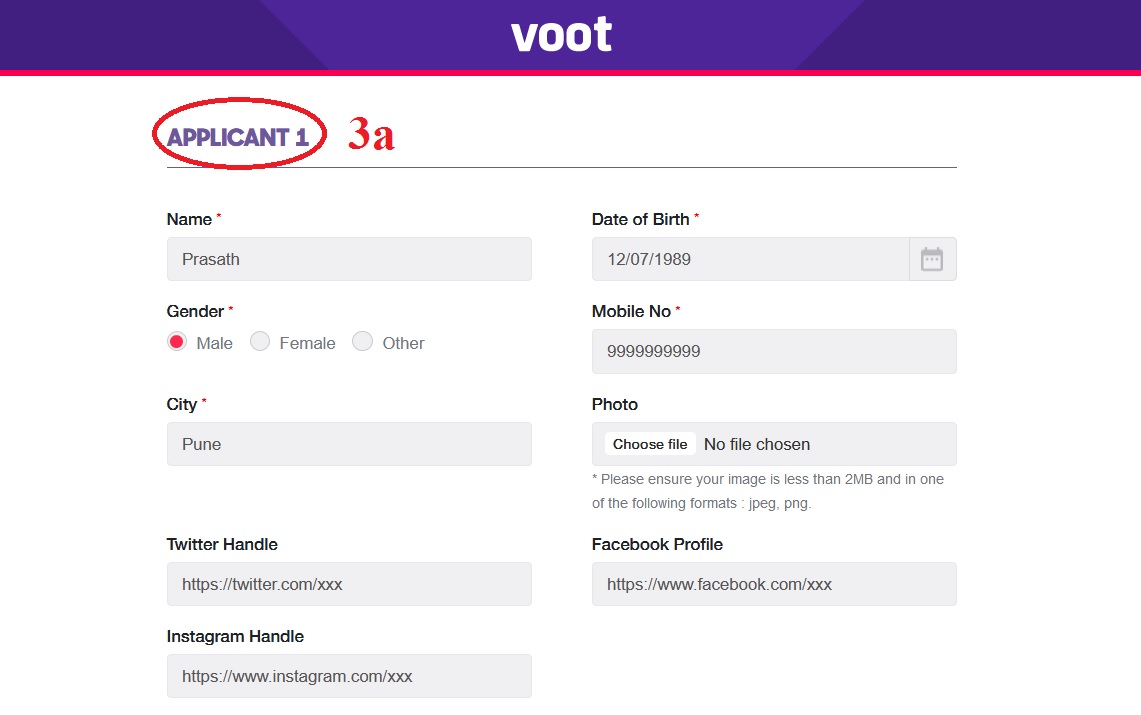 3a) Applicant 1: In the ‘Applicant 1’ section, Fill the personal details of Applicant 1 like Name, Gender, City, Date of Birth, Mobile Number, Twitter /Facebook/ Instagram and upload the latest photo of Applicant 1.