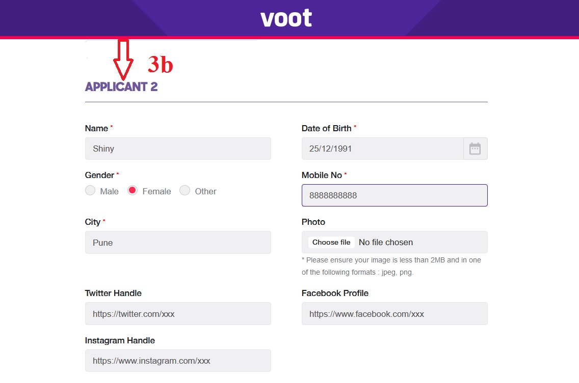 3b) Applicant 2: In the ‘Applicant 2’ section, Fill the personal details of Applicant 2 like Name, Gender, City, Date of Birth, Mobile Number, Twitter /Facebook/ Instagram and upload the latest photo of Applicant 2.