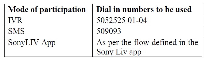 One Competition question having four multiple choice answer options will be aired each day during the promotions of the Show for select mobile telephone subscribers (Airtel/ / BSNL/ Idea/ Reliance/ Vodafone/ Jio), excluding any calls made from a public call office (PCO) and users that register using the SonyLIV application available on iOS and Android platforms through the methods stated in point 5 below i.e. a total of ten (10) unique questions will be asked during the First Round Period.