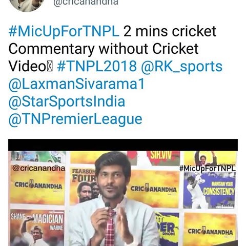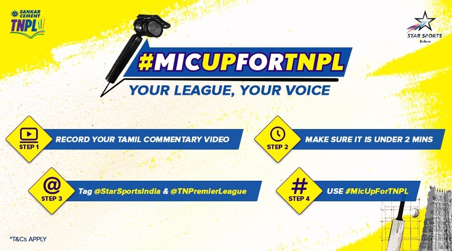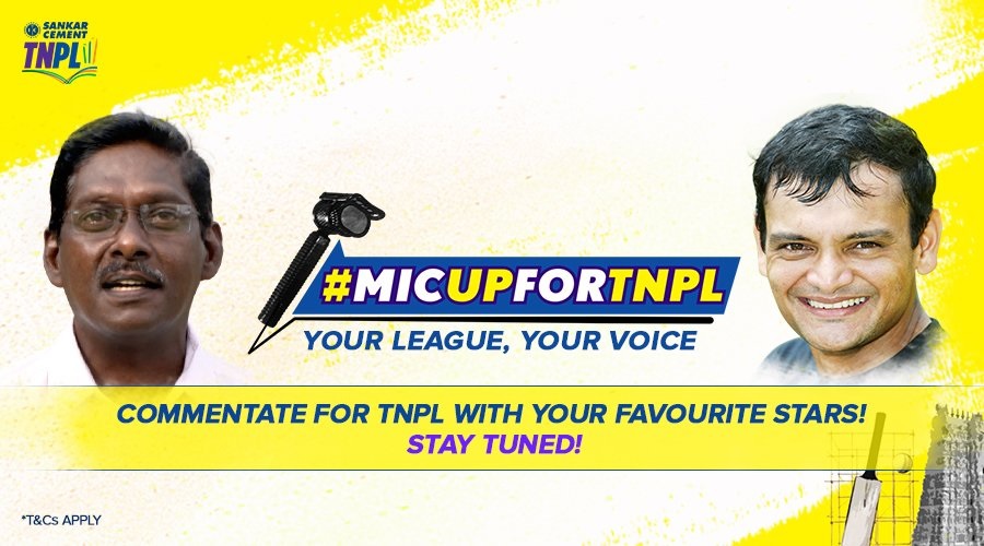 Want to commentate with the likes of L.Sivaramakrishnan and @RK_sports this #TNPL? Upload a 2 min video of your Tamil commentary tagging @StarSportsIndia and @TNPremierLeague with #MICUPFORTNPL and stand a chance to follow your dreams!