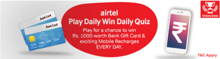 Superb Chance to win Rs.1000 Every Day !! That’s absolutely TRUE. Play and answer some easy questions in Airtel’s PLAY DAILY WIN DAILY QUIZ for a chance to be the winner of Rs.1000 worth Bank Gift Card and Daily Mobile Recharges.