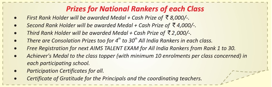 The Centre conducts the All India Maths Science Talent Examination (AIMS Talent Exam) for Std. I, II,III, IV, V, VI, VII, VIII, IX and X and awards cash prizes and consolation prizes as well to the Class Toppers at the National Level.