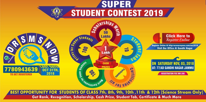 Jammu Super Student Contest 2018 is a specially designed initiative to encourage young talent with cash prizes, scholarships and mentoring by Race Narayana IIT/NEET Academy.