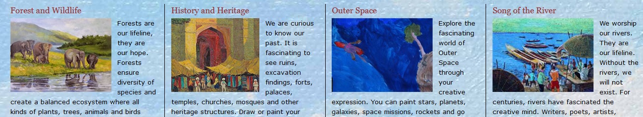 Forest and Wildlife, History and Heritage, Outer Space, Song of the River, Travel Diaries, Connecting India, Education for All, Festival of Lights, Hanging out with Friends, Me and my Selfie, Memorable Train Journey, My Favourite Cartoon Character, My favourite film, Save Trees Grow Trees, Swachh Bharat, The Charm of Railways, Water is Life, Abstract, Ajanta, Animals, Architecture, Birds, Boats, Buddha, Buddhism, Chai, Children, Christ, Cityscapes,