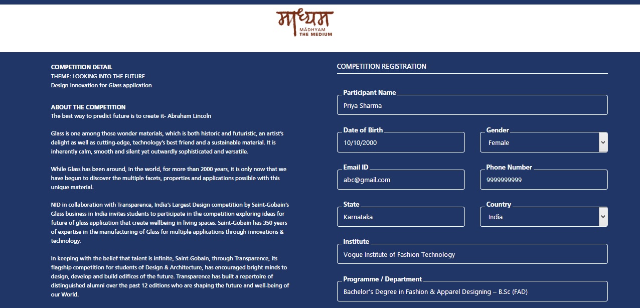 Madhyam contest is conducted by National Institute of Design (NID, Ahmedabad). NID in collaboration with Transparence, India’s Largest Design competition by Saint-Gobain’s Glass business in India invites students to participate in the competition exploring ideas for future of glass application that create wellbeing in living spaces.