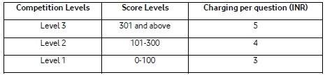 Each Competition Pack Member shall be charged Rs.3 or Rs.4 or Rs.5 per question as per the Competition level he/she is on based on table A below;