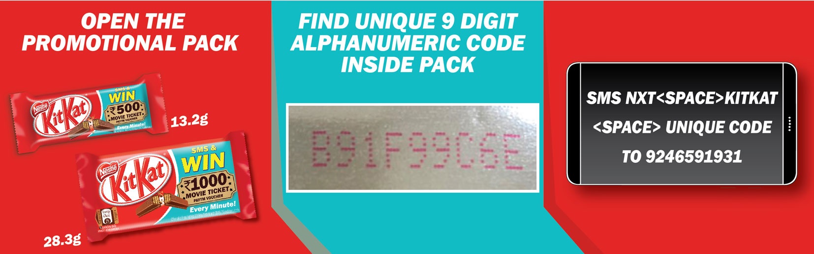 (i) As a first step, Participants are required to send an SMS with a valid Unique Code printed on the inner side of the pack from any GSM or CDMA mobile phone. e.g. NXTKITKATUNIQUECODE to 9246591931