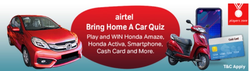 Breaking News! In Bring Home A Car Quiz, just answer one question correctly for a Bank Gift Card worth up to Rs 25000. Also, play for a brand new Honda Amaze car, Honda Activa, LEDTv, Smartphone, Recharge and more. You just have to Subscribe to Airtel Players Zone now and participate in the quiz for this amazing winning chance.
