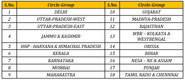 Applicable States/UTs : Delhi, Uttar-Pradesh-West, Uttar Pradesh East, Jammu & Kashmir, Punjab & Haryana & Himachal Pradesh, Andhra-Pradesh (Excluding Telangana), Kerala, Karnataka, Mumbai, Maharastra, Gujarat, Madhya-Pradesh, Rajasthan,Kolkata & West Bengal, Orissa, Bihar, North East & Assam, Tamil Nadu & Chennai.