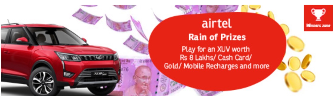 To bring prizes like XUV worth 8 lakh Rupees home, you just need to Subscribe to Airtel Winners Zone and play in Rain of Prizes Quiz. Answer easy questions correctly every day at only Rs.7/day for getting all the chances to win Cash Card, Gold Card, LED TV and mobile recharges.