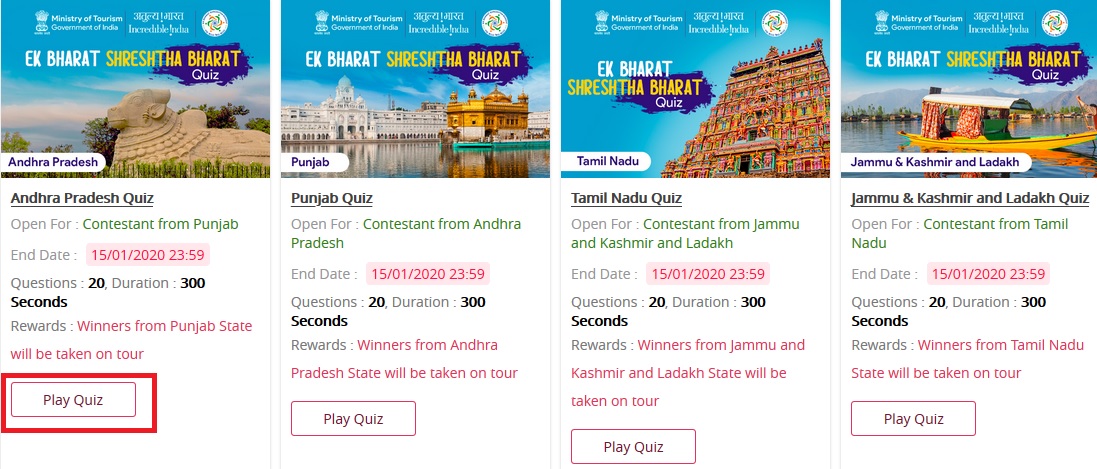 Ministry of Tourism Ek Bharat Shreshtha Bharat Quiz Contest 2020 : mygov.in