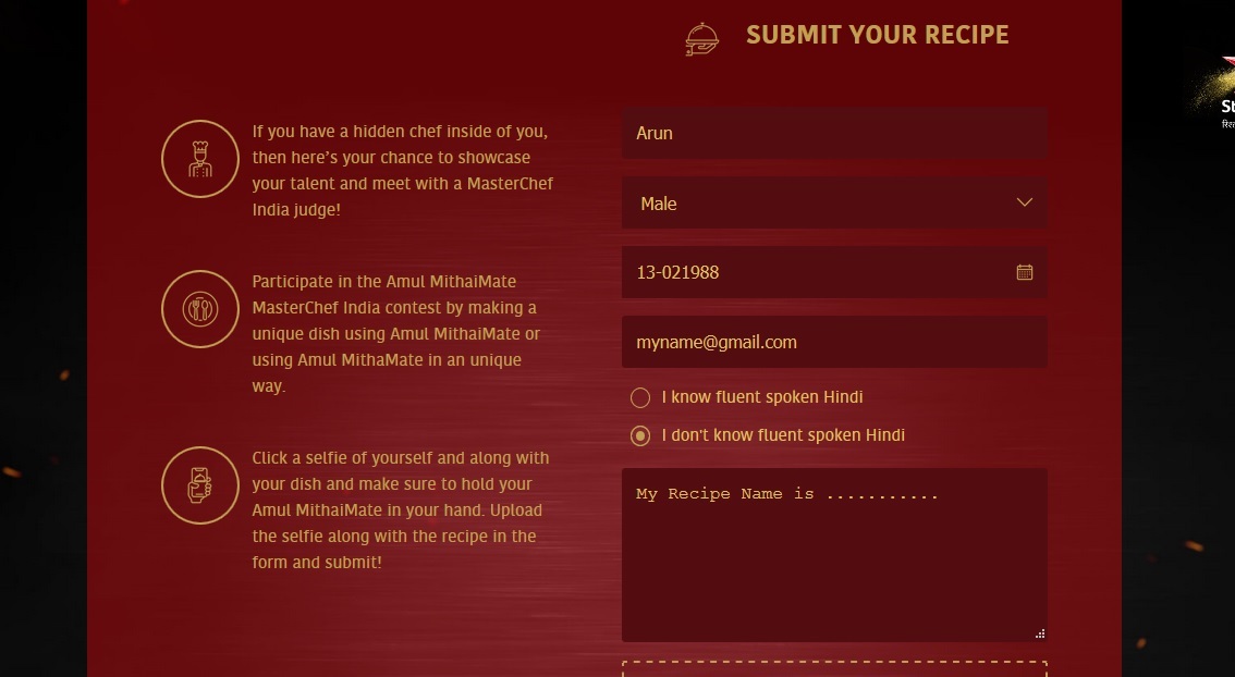1. Visit the Microsite at www.amulmithaimatemasterchefcontest.hotstar.com, confirm your age and accept the Terms and Conditions and submit their full name, email id, the name of their city where they reside, etc.