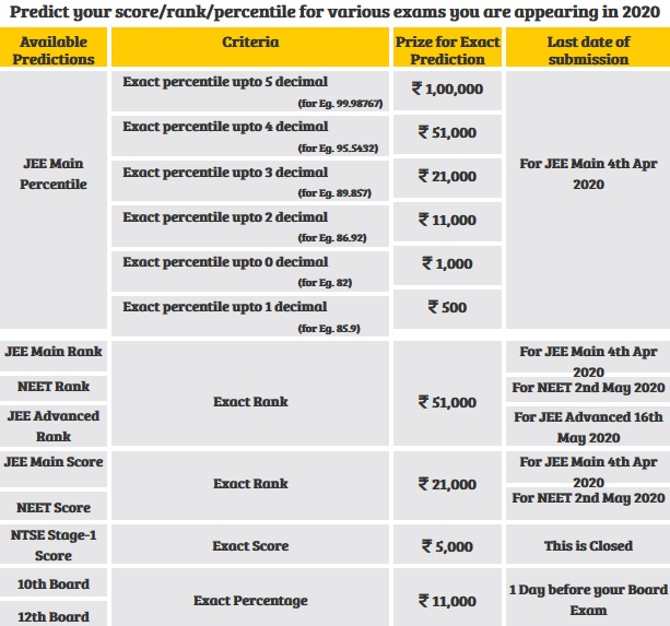 A contestant is only allowed to submit 2 different predictions i.e. if a contestant has predicted his JEE Main score then he can again enter the contest for JEE Advanced Rank, JEE Main Rank or CBSE 12 Board percentage (current year appearing only).