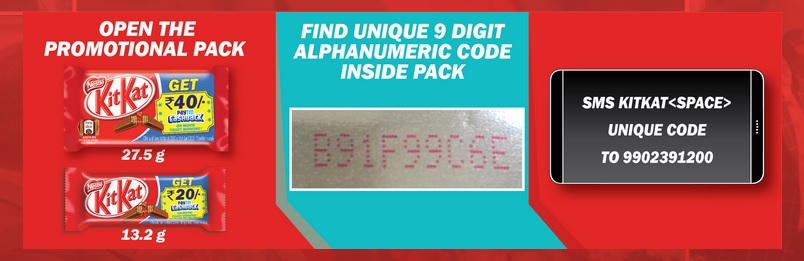 Any person who purchases a pack containing details of the Offer of KitKat 2 Finger Mini (12.8g at MRP Rs.10/-) or KitKat 3 Finger (27.5g at MRP Rs.20/-)during period commencing from 1st March 2020 to 15th April 2020 (“Offer Period”) will get a 9 digit alphanumeric unique code printed inside the Product wrapper