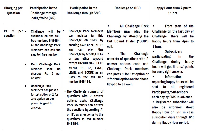 v. For Prepaid Subscribers – Subscribers must have the minimum requisite balance of Rs.4 / 5 / 6, for each day of the Challenge Period, to be eligible to participate in this Challenge on that day