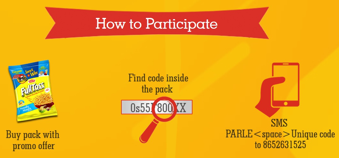 (i) As a first step, Participants are required to send an SMS with a valid Offer Code printed on the pack from any GSM or CDMA mobile phone. e.g. (PARLE<space>UniqueCode) 8652631525 *Standard sms charges apply