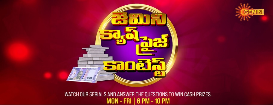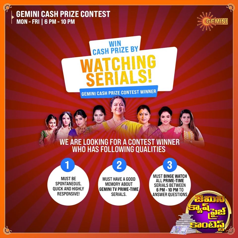 Gemini Cash Prize Contest! Watch your favorite Gemini TV Serial from 6 PM to 10 PM and answer the simple questions to win cash prizes.