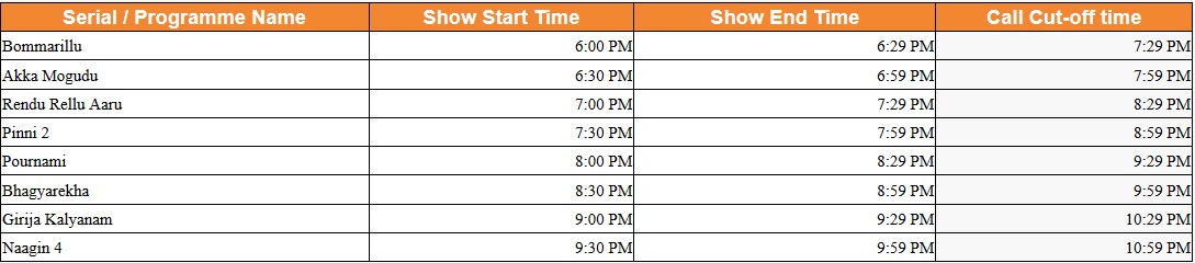 ** “Gemini TV” will ask 1 question to the viewers at the end of the following serials: Bommarillu, Akka Mogudu, Rendu Rellu Aaru, Pinni-2, Pournami, Bhagya Rekha, Girija Kalyanam and Naagini-4 , which will be aired between 6:00 pm and 10:00 pm from Monday to Friday during the contest period.