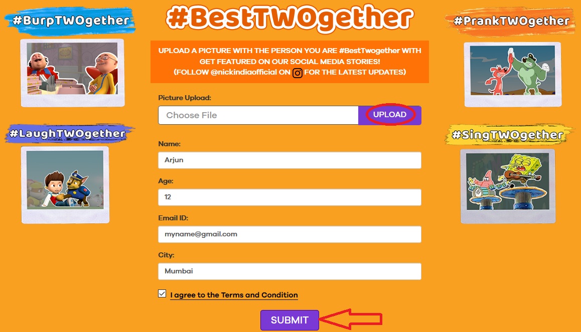 b) upload on the Contest Page, an image of the Participant together with who they are #BestTwogether with, which best depicts their special bond. The Contest Entry can be uploaded as per instructions provided under the Contest post.