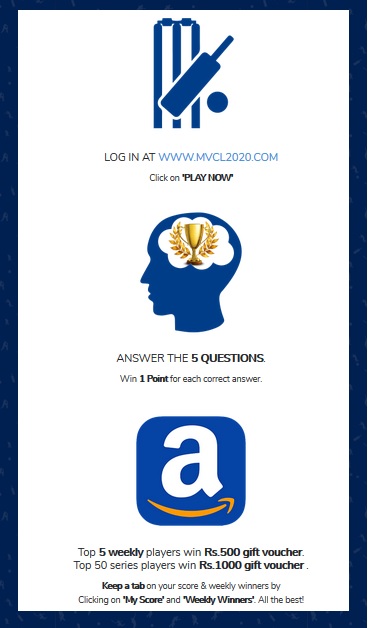 Winners will be chosen on the basis of points scored in the quiz for each cricket match. For every cricket match week there will be top 5 winners every week and top 50 winners at the end of cricket season under this Contest.