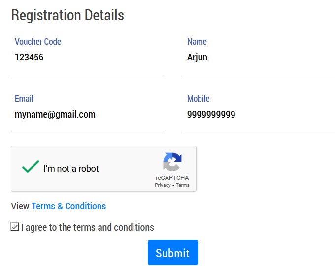 1. Enter your Voucher Code, Name, Email ID, Mobile No and Click Submit