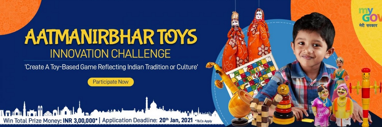 In order to give visibility to the Indigenous Toys manufacturer, MyGov is honoured to launch a National level ‘AATMANIRBHAR TOYS INNOVTION CHALLENGE’, to encourage Indians to design toy-based games based on Indian tradition, culture, heritage, mythological stories and characters.