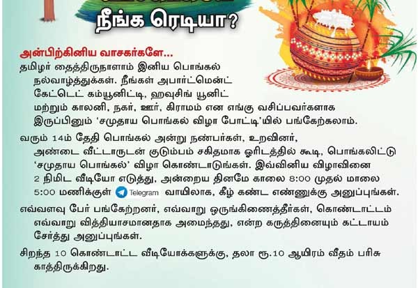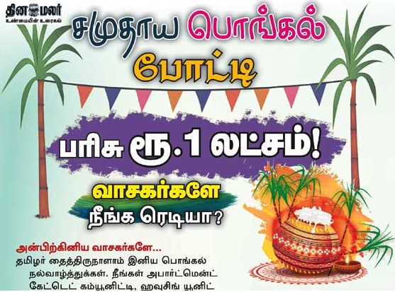 Happy Tamil Pongal. Regardless of where you live in the apartment cate community, housing unit and colony town, village, you can participate in the ‘Community Pongal Festival Competition’.