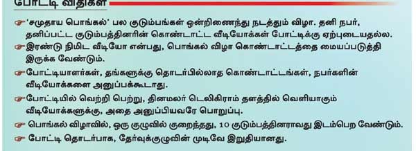 ** ‘Community Pongal’ is a festival held by many families together. Celebration videos of individual and individual families are not eligible for the competition.