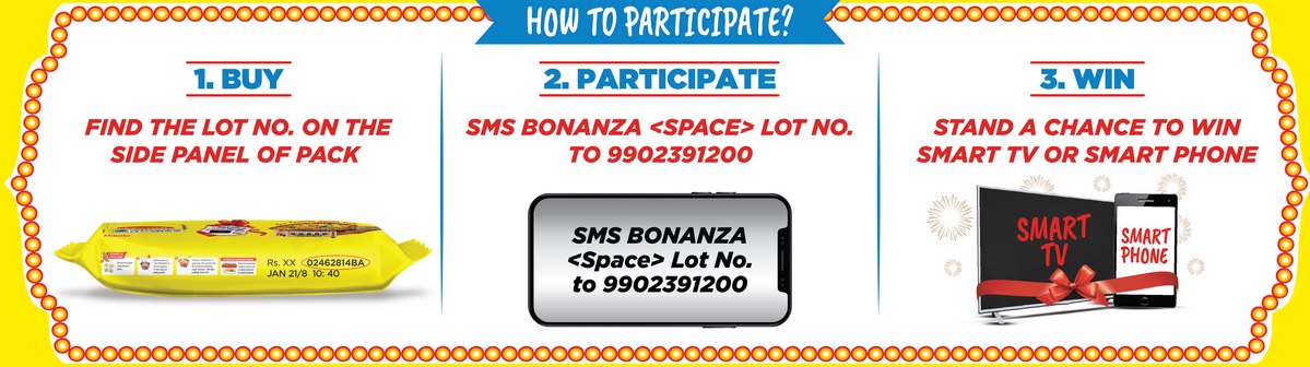 1. To participate, the batch code given on the pack has to be sent via SMS to the number mentioned on the pack in the following format: BONANZALot Number to <9902391200>. Upon successfully sending the details in the described format, the participant will be informed via SMS of their valid participation.