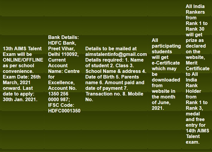 13th AIMS Talent Exam will be ONLINE/OFFLINE as per school convenience.