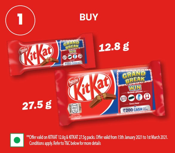 ** During the Program Period ( January 15th 2021 at 09:00 hours and after March 1st 2021 at 21:00 hours) Participant stands a chance to win either Per minute prize- A total of 720 Winners will be chosen from amongst all Participants in a day (9 AM to 9 PM) every day, during the Promotion Period. They will be eligible for a per-minute prizes of Rs. 100/- (applicable on purchase of KITKAT 2 Finger Mini 12.8g only) or Rs.200/- (applicable on purchase of KITKAT 3 Finger 27.5g only).