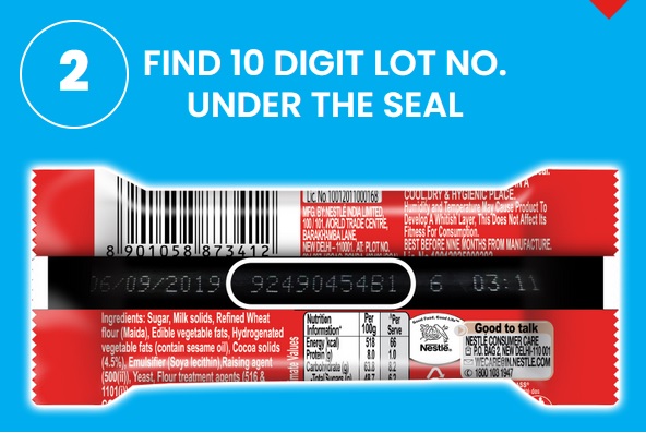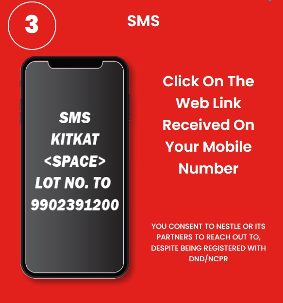 Step 1 : As a first step, Participants are required to send an SMS with 10 digit valid Lot No. Code printed on the seal of the Promo Pack laminate from any GSM or CDMA mobile phone. e.g. KITKAT LOT NO. to 9902391200.