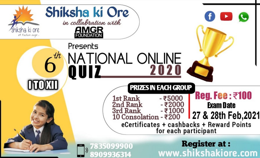 Shiksha Ki Ore Online Quiz – 2020 is being run by AMGR Foundation, Noida, will be held on 27 february 2021 & 28 february 2021 and shall be conducted on www.shikshakiore.com.