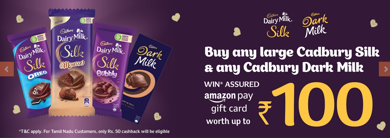 ** There are total of up to 144,156 Amazon Pay Gift Voucher, which can be won on the purchase of Cadbury Dairy Milk Silk large bars (MRP over Rs. 125 each) and/or Cadbury Dark Milk with a value of minimum Rs. 250 at a participating Retail Store (“Prize”) except for the State of Tamil Nadu, where the Prize is assured as mentioned above.
