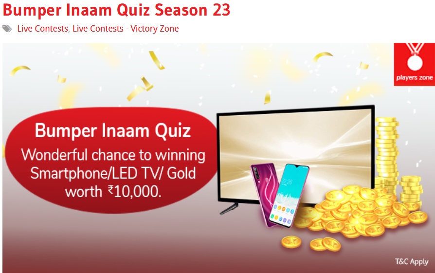 Airtel Victory Zone brings you another wonderful season of Bumper Inaam Quiz! Participate now to score the required points and you could win a Smartphone/LED TV/Gold worth up to Rs 10,000.