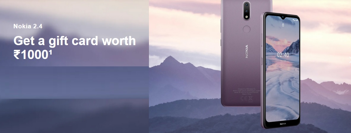 Receive a Gift Card worth INR 1000 on the purchase of Nokia 2.4 purchased only from 1st February, 2021 until 31st March 2021 (Nokia 2.4 Consumer Promo LIMITED PERIOD OFFER) or till the stock lasts, whichever is earlier on www.nokia.com/phones . The Gift Card can only be redeemed on the subsequent purchase of a product from www.nokia.com/phones