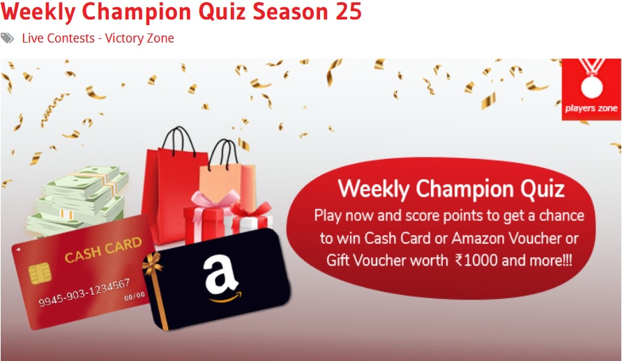 Airtel Victory Zone is back with another great season of Weekly Champion Quiz! Participate now and Play on for a chance to win a Cash Card/Amazon Gift Voucher worth up to Rs 1000 as Weekly Bumper Prize and weekly Online Gift Vouchers worth 100 rupees and more.