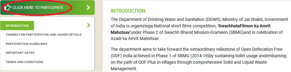 The Department of Drinking Water and Sanitation (DDWS), Ministry of Jal Shakti, Government of India is organizinga National short films competition, ‘SwachhataFilmon ka Amrit Mahotsav’under Phase 2 of Swachh Bharat Mission-Grameen (SBMG)and in celebration of Azadi ka Amrit Mahotsav.