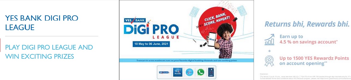 YES BANK is running contest from 10 May 2021 to 6 June 2021 – Digi Pro League a digital contest that is run on YES BANK Digital channels for YES BANK customers holding Individual Savings / Current Account.