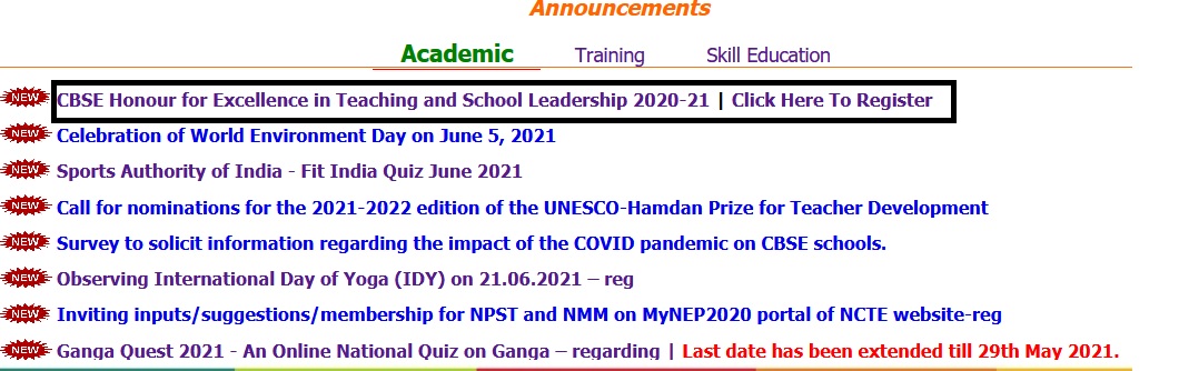 CBSE Honour For Excellence in Teaching & School Leadership 2020-21 : cbseacademic.nic.in